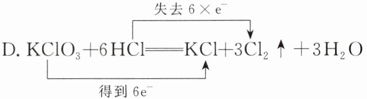 选项D:$KClO_3$中Cl元素从+5价降低到0价,得到$5×e^-$;$HCl$中Cl元素从-1价升高到0价,失去$1×5e^-$,而原选项中表示为得到$6e^-$和失去$6×e^-$,电子转移表示错误。