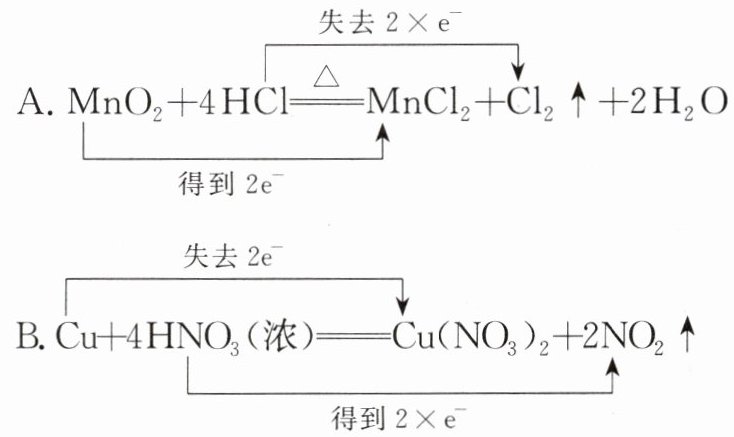 选项A:$MnO_2$中Mn元素从+4价降低到+2价,得到$2×e^-$;$HCl$中Cl元素从-1价升高到0价,失去$2×e^-$,电子转移表示正确。