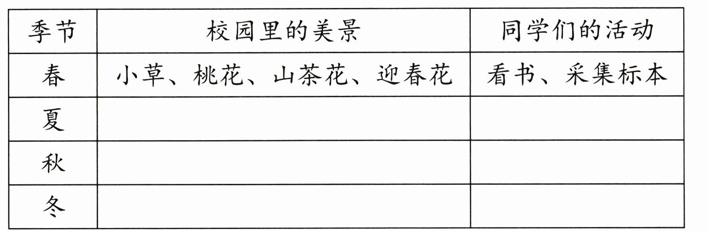 |春|小草、桃花、山茶花、迎春花|看书、采集标本|