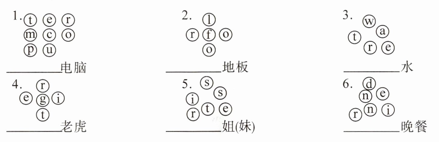 1. computer 2. floor 3. water 4. tiger 5. sister 6. dinner