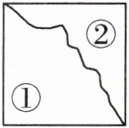 观察图形可知,两部分的面积明显不相等;两部分的周长都等于正方形的两条边长加上中间的公共曲线边长,所以周长相等。
