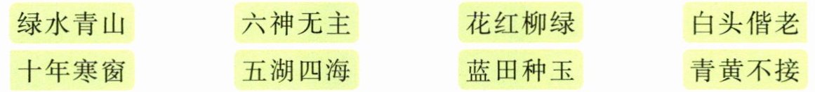 (2)示例:我会制定这样的游戏规则:摸到含有两种颜色或含有两个数字的成语卡片(绿水青山、花红柳绿、青黄不接、五湖四海),“勤学小组”先选礼物;摸到含有一种颜色或含有一个数字的成语卡片(六神无主、白头偕老、十年寒窗、蓝田种玉),“勇进小组”先选礼物。
