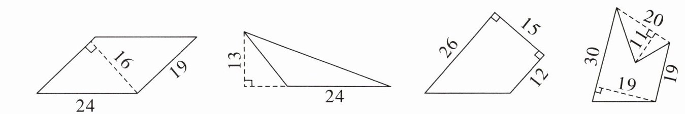 $ 19 × 16 = 304(cm^{2}) $ $ 24 × 13 ÷ 2 = 156(cm^{2}) $ $ (12 + 26) × 15 ÷ 2 = 285(cm^{2}) $ $ (19 + 30) × 19 ÷ 2 - 20 × 1 ÷ 2 = 355.5(cm^{2}) $