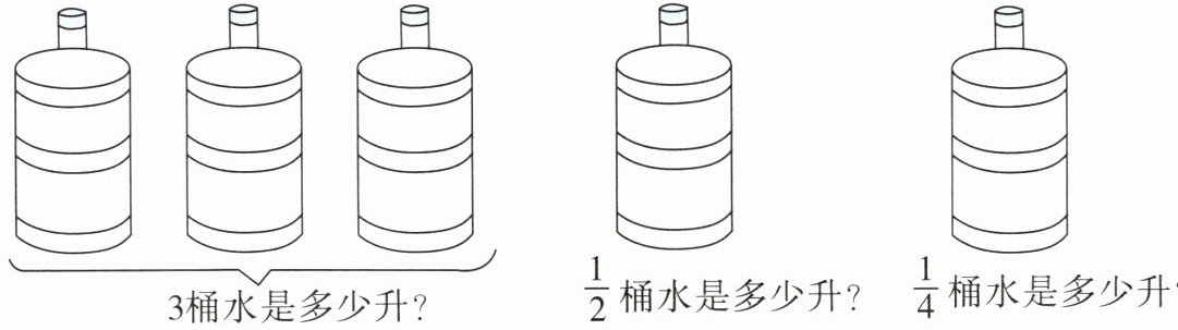 答:3桶水共36升,$\frac {1}{2}$桶水是6升,$\frac {1}{4}$桶水是3升。