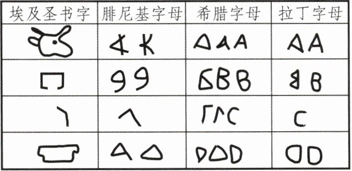 C 解析:从材料内容可以看出,字母文字在演变的过程中越来越简单以适应日常使用,所以文字的发展是由繁到简的过程,故选 C 项。表格中没有比较信息,不能说明字母文字是世界上最早的文字,排除 A 项;仅根据字母文字的演变不能得出私有制发展推动了文字的产生,排除 B 项;结合所学知识可知,文字在起源之初并不具有完整体系,是后来不断发展完善的,排除 D 项。
