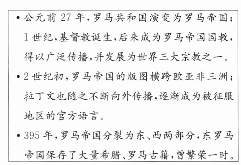 D 解析:据材料“基督教诞生……得以广泛传播”“拉丁文也随之不断向外传播”“东罗马帝国保存了大量希腊、罗马古籍”可以得出,罗马帝国的扩张客观上促进了人类文明的传播,故 D 项正确。