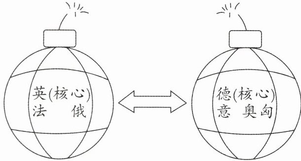 B 解析:根据材料并结合所学可知,图中两大军事集团应是协约国和同盟国。为了重新瓜分殖民地,争夺世界霸权,主要帝国主义国家都在寻求同盟者。20世纪初,欧洲形成两大敌对的军事集团:一个是以德国为核心的同盟国,主要成员国有德国、奥匈帝国、意大利;一个是以英国为核心的协约国,主要成员国有英国、法国、俄国。它们竞相扩军备战,最终导致一战爆发,故B项正确。