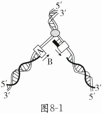 (1)长方形 A 催化游离的脱氧核苷酸形成互补链,是 DNA 聚合酶,箭头 B 代表的是 DNA 复制的方向。