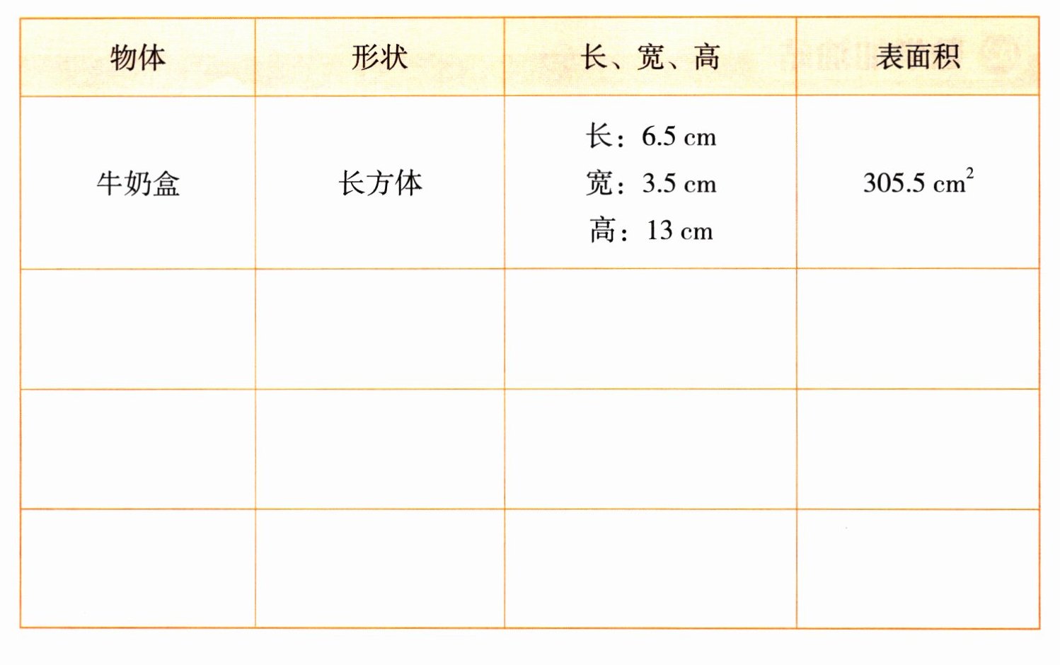 解析:本题主要考查长方体和正方体的表面积计算,需要我们先通过实际观察找出身边的长方体或正方体物体,然后测量它们的长、宽、高或棱长,最后利用公式计算它们的表面积。