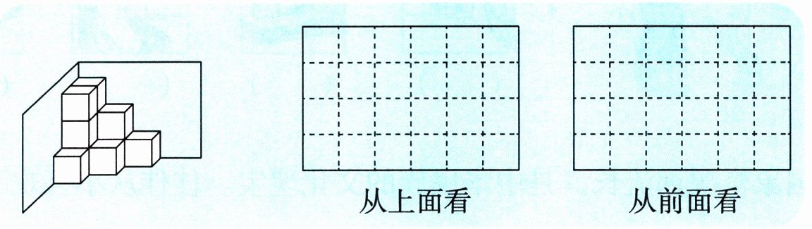 (3)纪念品中心的纪念品摆放方式如下图所示,请你在方格图中画出这堆纪念品从上面、前面看到的图形。如果方格图中每个小正方形的边长为4分米,则从前面看到的图形的周长是( )分米。