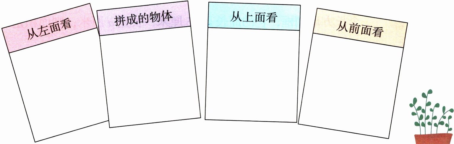 用家中的积木玩具拼一拼,摆一摆,将摆好后的物体从不同的方向观察一下,然后给它做一个小档案。试着将不同方向看到的图形画在下面吧!