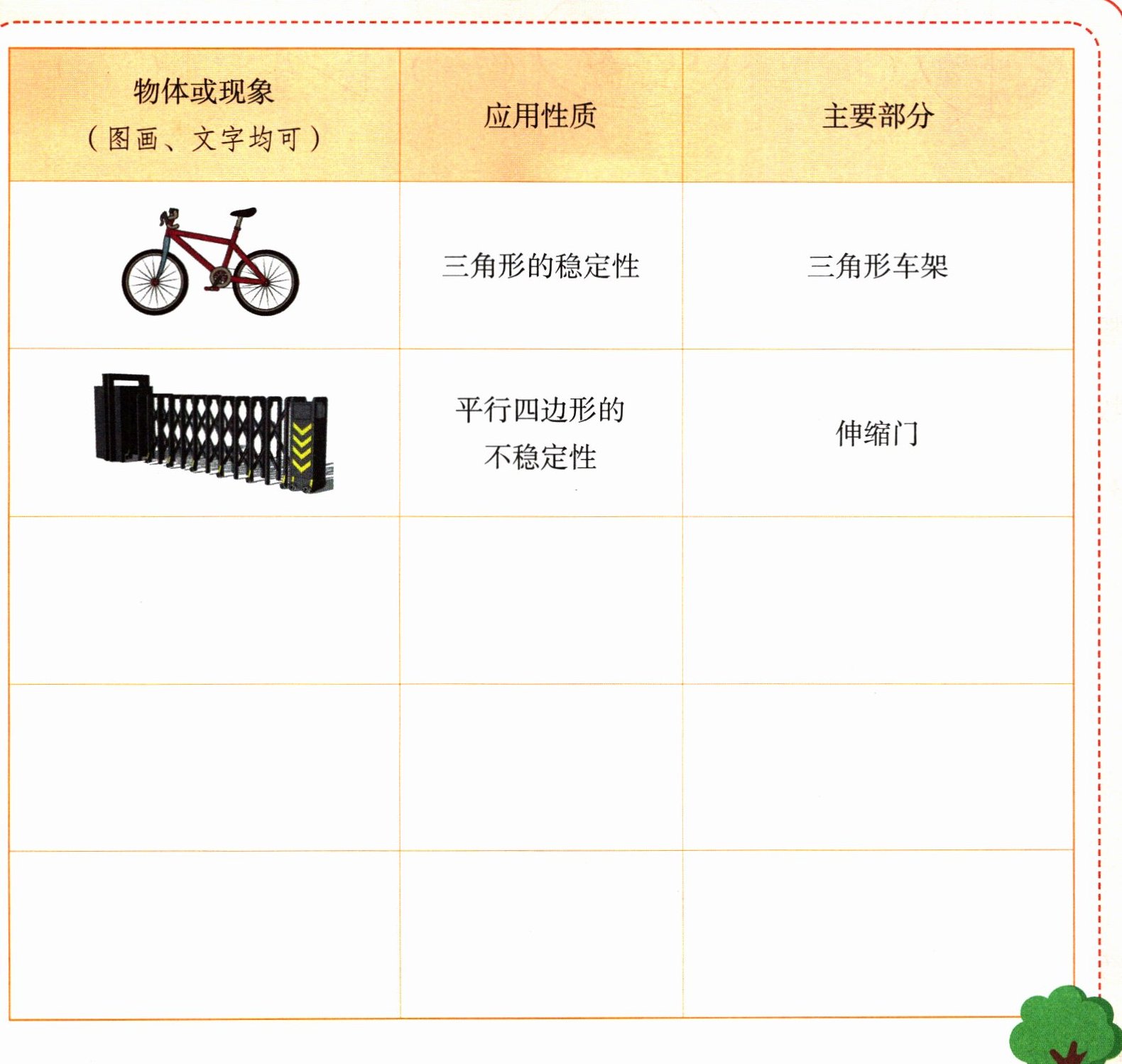 通过学习,我们知道了三角形具有稳定性,平行四边形具有不稳定性。你还能找到哪些这两种性质在实际生活中的应用?试着写一写。