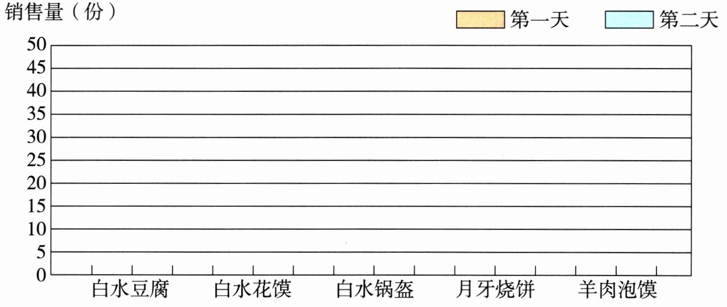 (3)端午节期间,该美食店第二天白水花馍比白水锅盔多卖了( )份;第一天卖的羊肉泡馍比第二天多( )份。