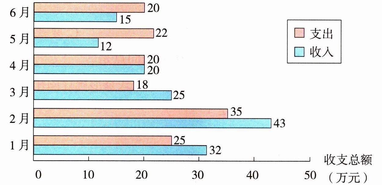 上半年总收入为:$32 + 43 + 25 + 20 + 12 + 15 = 147$(万元)。