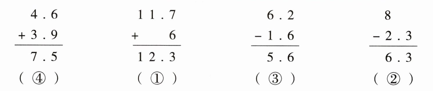 第一题:$4.6 + 3.9 = 8.5$,但图中计算结果为$7.5$,原因是两数相加满十后没有向前一位进1,对应序号④。
