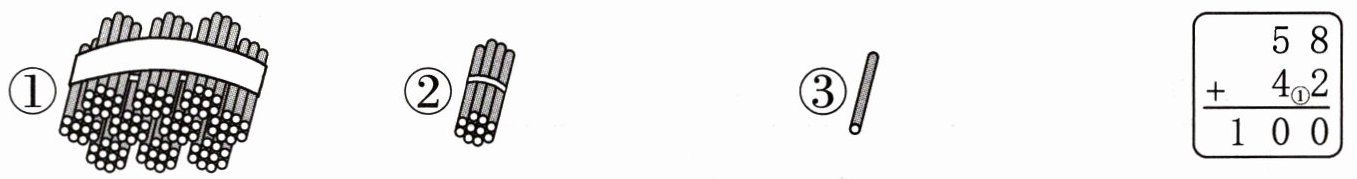 3. 小红用摆小捧的方法思考$58 + 42$的计算过程,并列出了竖式。与竖式中圈出的“1”对应的小棒图是(