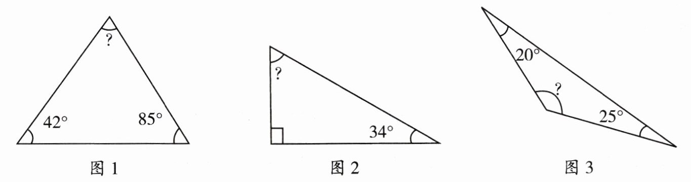 四、求出下面三角形中未知角的度数。