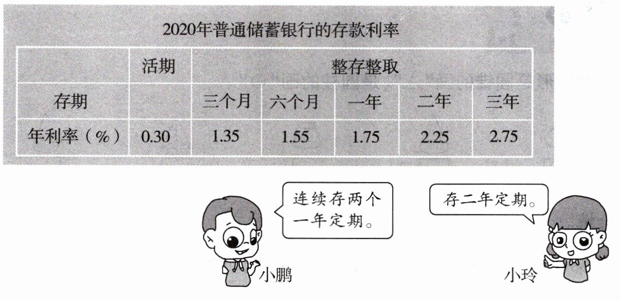 4. 李林准备把自己积攒的 1000 元零花钱存入银行,等两年后上中学用。下面是两位同学为他提供的两种储蓄方式,你认为谁提供的储蓄方式获得的利息多?结合下面的利率表算一算。(提示:第二年小鹏连本带息一并作为本金存进去)