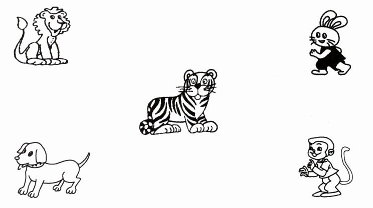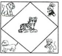把图中的5种动物放在一起是很危险的。你能在图中画2个正方形,将它们分隔开来吗?