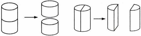 6. 冬冬买了两根香肠(形状近似圆柱),把第一根横向切开,分成两段;把第二根沿圆柱底面直径纵向切开。想一想,这两根香肠切完后的截面形状一样吗?各是什么形状?