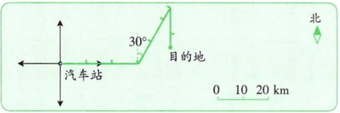 2. 一辆出租车从汽车站出发向东行驶 $ 30km $ 后,再向北偏东 $ 30^{\circ} $ 方向行驶 $ 25km $,然后向南行驶 $ 15km $ 到达目的地。