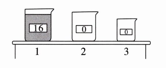 有 3 个没有刻度的玻璃杯,从左到右容积分别是 16 L,9 L,7 L,其中 16 L 杯子装满了水,请移动这三个杯子 15 次,将水均分为 2 个 8 L。