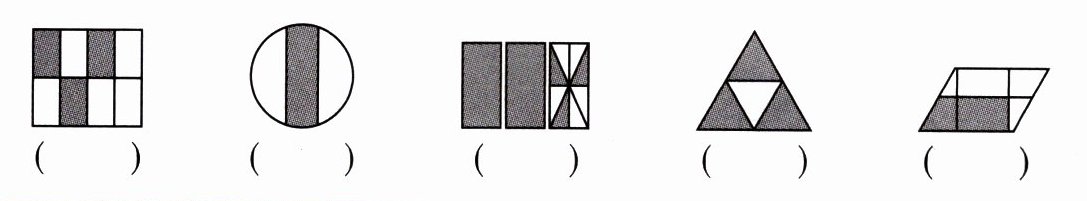 4. 下面各图中的阴影部分,能用分数表示的就在括号里写出这个分数,不能用分数表示的画“×”。