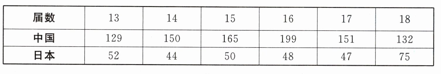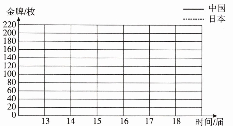 5. 亚运会是亚洲规模最大的综合性运动会,下面是第13~18届亚运会中国和日本获得金牌情况表。