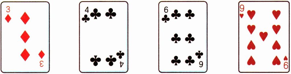 下面有4张扑克牌,请你运用“+”“-”“×”“÷”或者括号,将它们的点数组成一个综合算式,使算式的结果是24。