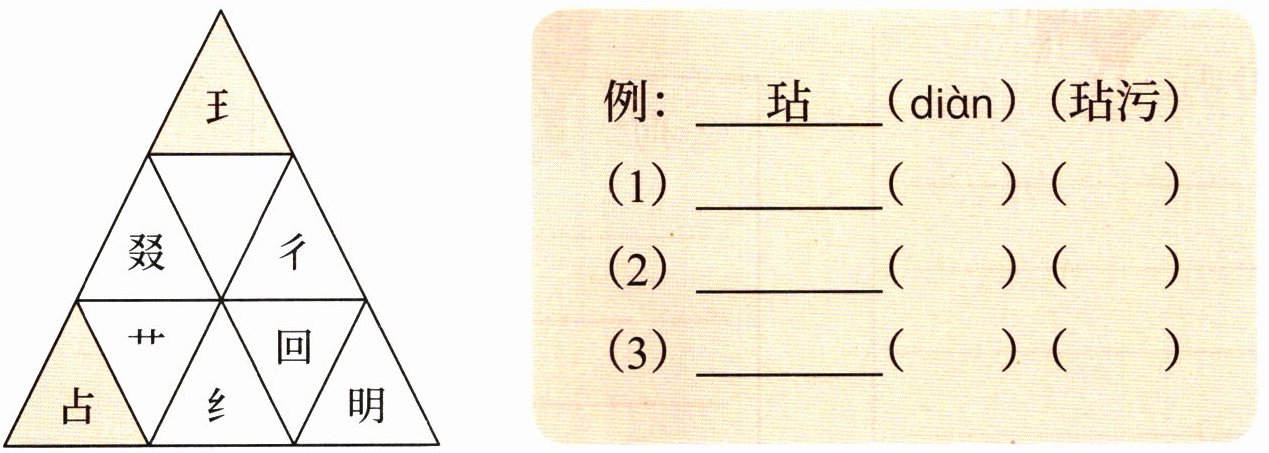 解析 本题考查字音、字形和字义。在金字塔图中找到能组成新字的两部分,涂上相同的颜色,然后再为组成的新字注音和组词即可。