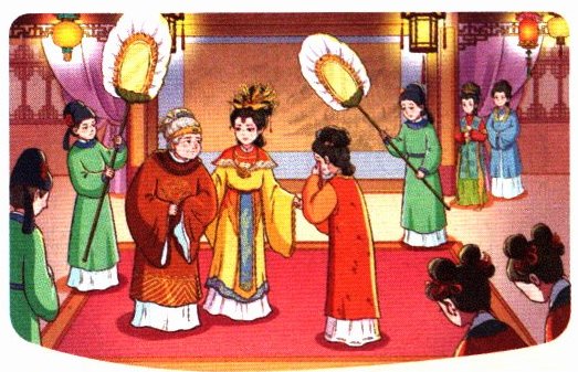(4)题,重点关注背景和其中的女子形象,可知这是《红楼梦》中元妃省亲的场景。