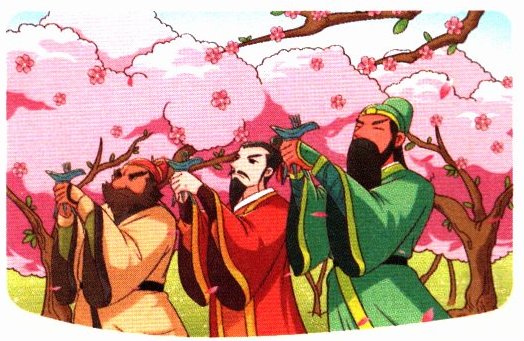 (1)题,重点关注三个人物及背后的桃园背景,可知这是《三国演义》中桃园三结义的场景。第