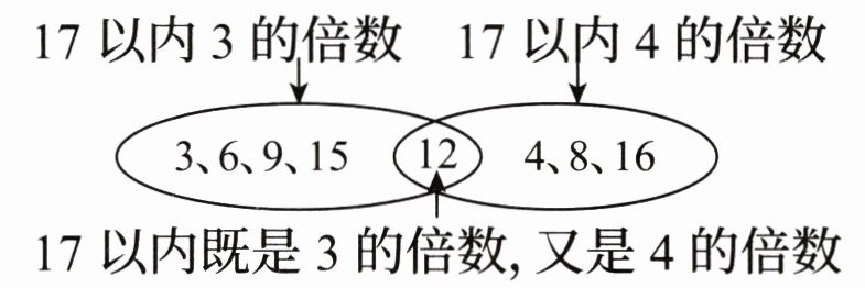 和$◯$圈出$3$的倍数、$4$的倍数,只有$12$是同时圈到的。珍奇分别列举$3$的倍数、$4$的倍数,可以发现重复出现的是$12$。丫丫画出韦恩图,找到$12$既是$3$的倍数,又是$4$的倍数。而郝帅先分别计算出$17$以内$4$的倍数有$4$个,$3$的倍数有$5$个,把个数相加并加上余数得到的$12$,只是碰巧与答案的得数一致,但思考过程不正确。所以选D。