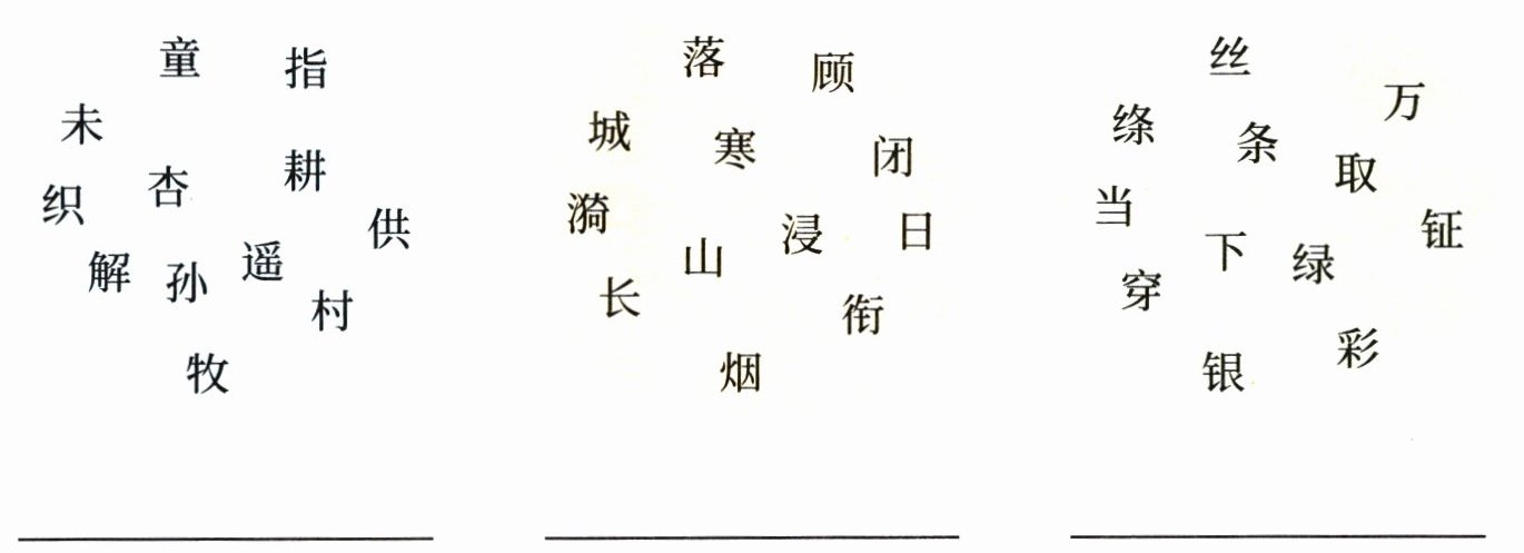 从下面的圆圈中挑选几个字,分别组成一句古诗,写在对应的横线上。