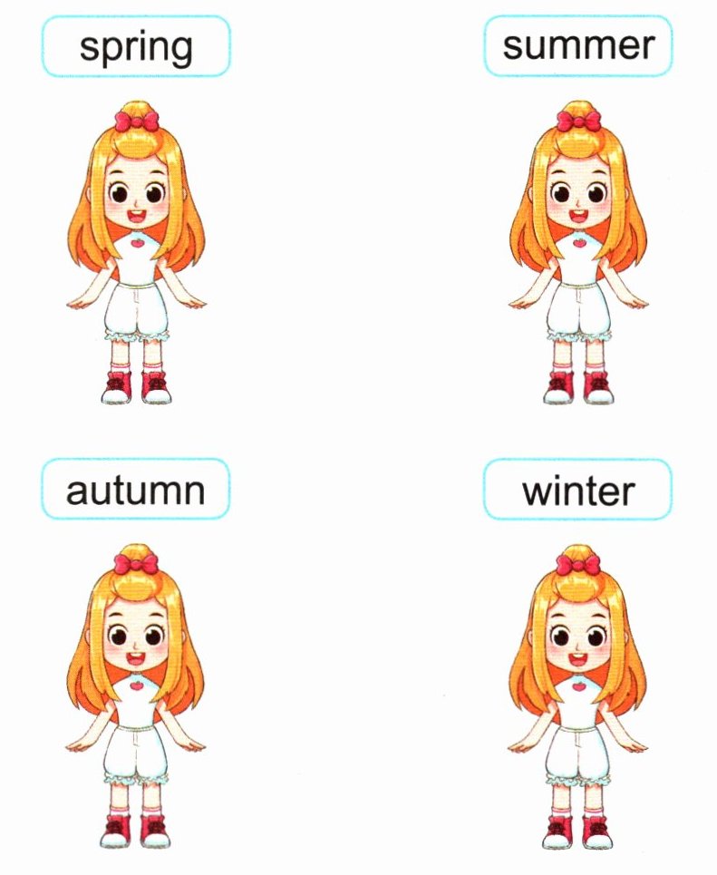 这是一道英语与绘画相结合的趣味题目。考查的知识点主要是对四季英文单词的理解,以及根据季节特点进行绘画创作的能力。解题方法是根据“spring(春天)”“summer(夏天)”“autumn(秋天)”“winter(冬天)”这四个季节单词,结合每个季节的气候特点,给珍奇画上不同的衣服。春天一般气温逐渐升高,可以画薄的长袖衣服;夏天炎热,画短袖短裤等清凉衣物;秋天气温转凉,可画长袖稍厚的衣服;冬天寒冷,画棉衣等厚衣服。