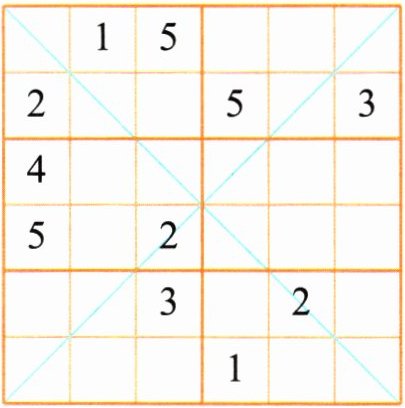 把 1~6 填入空格内,使得每行、每列、每宫以及每条对角线上的数均不重复。
