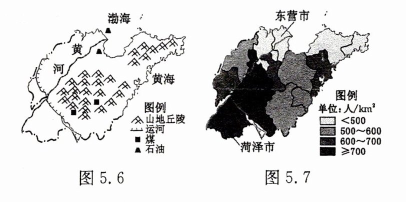 山东省是我国的人口大省和经济大省,历史文化底蕴深厚。中部和南部为突起的鲁中南山地丘陵,东部是起伏和缓的丘陵,西部和北部是黄河冲积而成的鲁西北平原。历史上黄河下游多次改道,每一次改道都会形成巨大的黄泛区,入海口处由于海水入侵,土壤盐渍化严重。1983年,东营市正式成立。图5.6示意山东省地形、矿产分布,图5.7示意某年山东16地市人口密度。