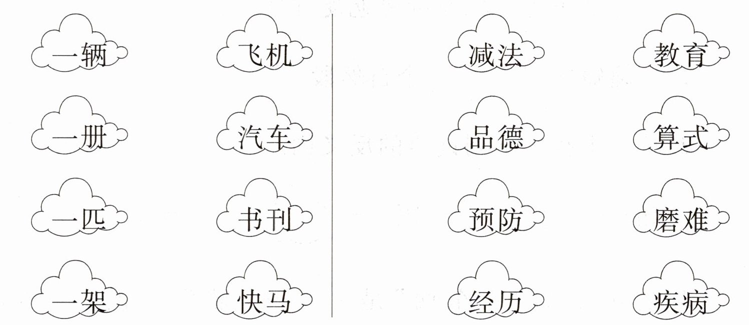 一辆汽车 一册书刊 一匹快马 一架飞机 减法算式 品德教育 预防疾病 经历磨难