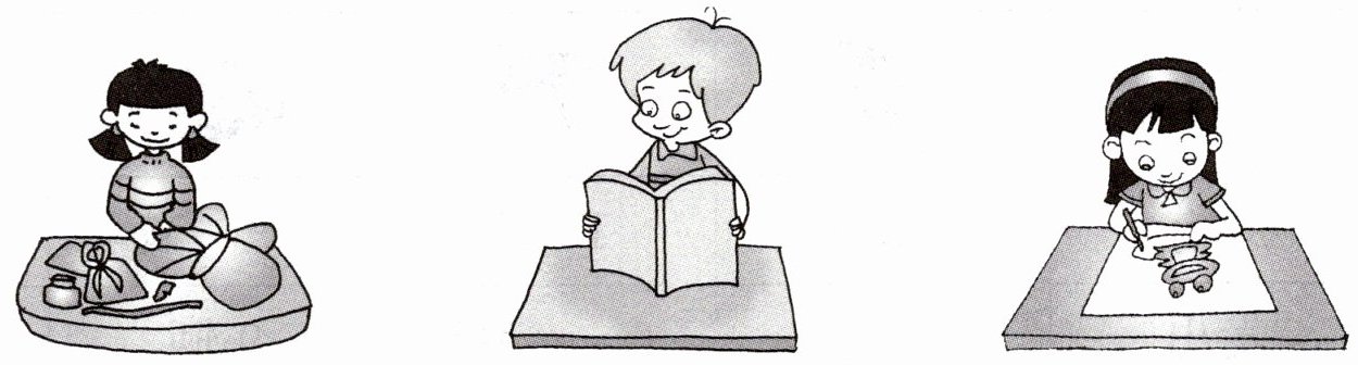 ●你能写出他们的名字吗?小明的左边是小军,右边是小青。