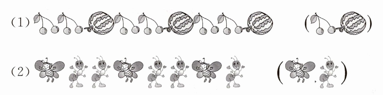 综上,$(1)$圈$\boldsymbol{2}$串樱桃(左边的图形 );$(2)$圈$\boldsymbol{1}$只蚂蚁(右边的图形 )。