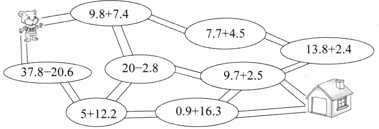 只有得数是 17.2 的路口才能通过,小熊回家该怎么走?你能找出几条路?