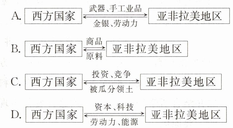 D 新航路开辟后特别是工业革命后,亚非拉的许多地区成了欧洲的商品销售市场和原料来源地,直接推动了欧洲生产的发展,故 D 项正确。