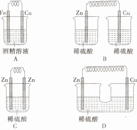 提示:装置D能构成原电池;装置A不能构成原电池,原因是酒精为非电解质;装置B不能构成原电池,原因是没有形成闭合回路;装置C不能构成原电池,原因是两个电极的金属活泼性相同。