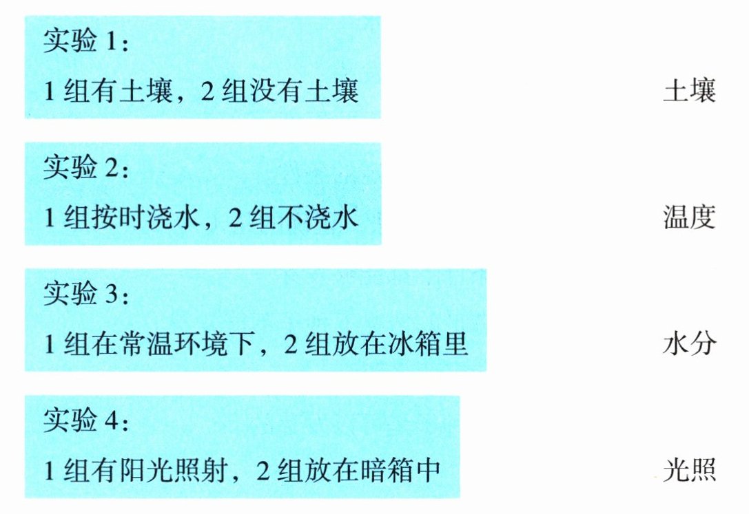 4. 对于实验4,1组有阳光照射,2组放在暗箱中,这里改变的是光照条件,因此实验变量是光照。