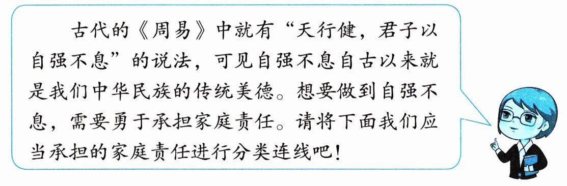 【解析】:本题可根据家庭责任的具体内容,结合所给的具体做法进行分类连线。主要考查对家庭责任不同方面的理解与判断能力。