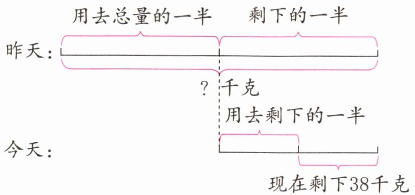 由图可知,现在剩下的 38 千克乘 2,得到的就是昨天用去了一半后剩下大米的质量,再乘 2 就是食堂昨天一共购进的大米的质量。