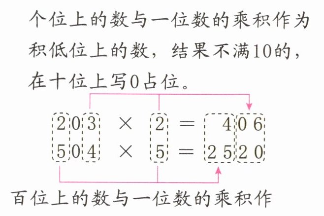 个位上的数与一位数的乘积作为积低位上的数,结果不满10的,在十位上写0占位。