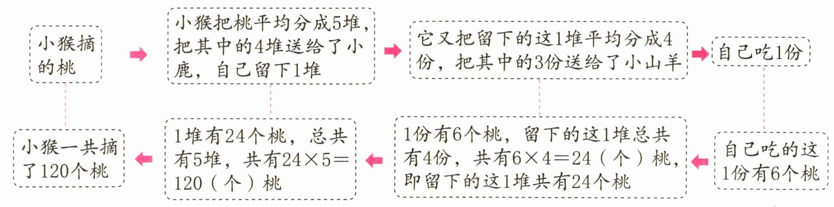 3. 培优题 小猴上山摘桃,它把摘到的桃平均分成 5 堆,把其中的 4 堆送给了小鹿,自己留下 1 堆。后来它又把留下的这 1 堆平均分成 4 份,把其中的 3 份送给了小山羊,1 份自己吃,自己吃的这 1 份有 6 个桃。小猴一共摘了多少个桃?