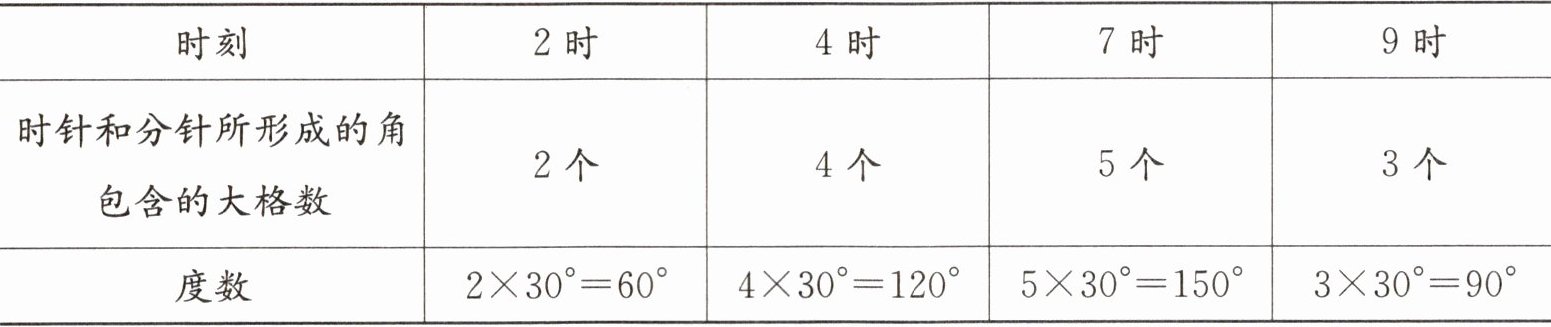 分析 知道钟面上一大格对应的角度是解题的关键。先测量出一大格对应的角度是 $30^{\circ}$,再观察钟面,数一数时针和分针之间有几个大格,就能确定时针和分针所形成的角的度数。