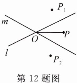 12. (2021·河北)如图,直线$l$,$m$相交于点$O$,$P$为这两直线外一点,且$OP = 2.8$。若点$P$关于直线$l$,$m$的对称点分别是点$P_1$,$P_2$,则$P_1$,$P_2$之间的距离可能是(